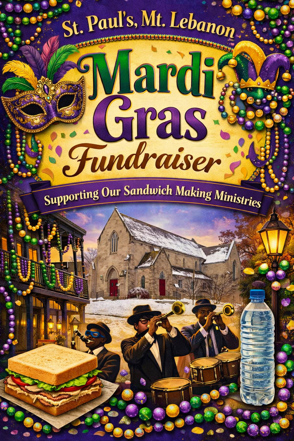 We're having a Mardi Gras Celebration in support of St. Paul’s Sandwich Making Ministry! St. Paul’s makes more than 1000 sandwiches a month to help feed people in need, and this fundraiser is a part of making this important ministry thrive.